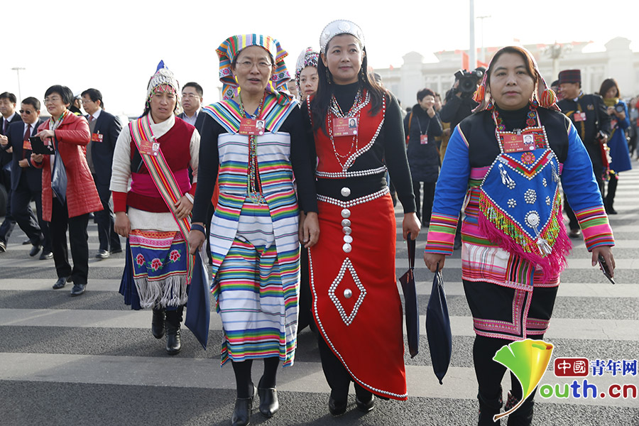 身着少数民族服装的人大代表整齐走向人民大会堂前。 中国青年网记者 张炎良 摄