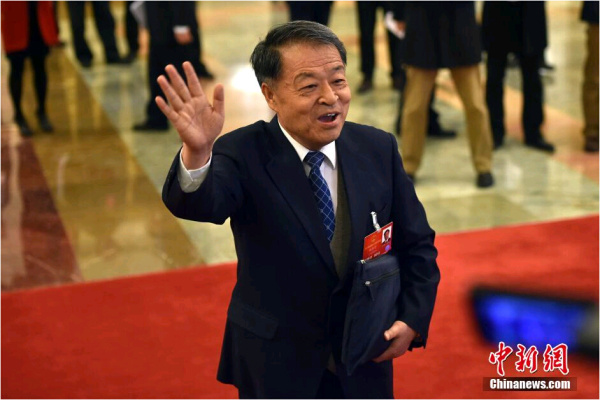 交通运输部部长杨传堂通过“部长通道”时与记者打招呼并接受采访。中新社记者 金硕 摄
