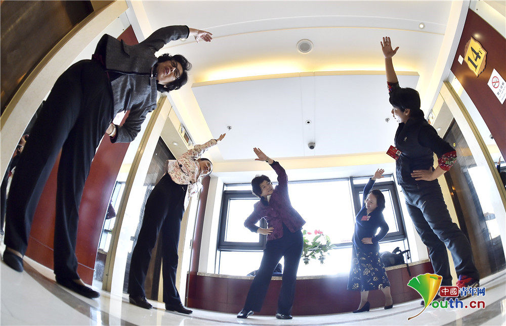 北京会议中心委员驻地,教育界的几位女委员跟随体育界委员王恋英练起了健身操。人民政协网记者 贾宁摄