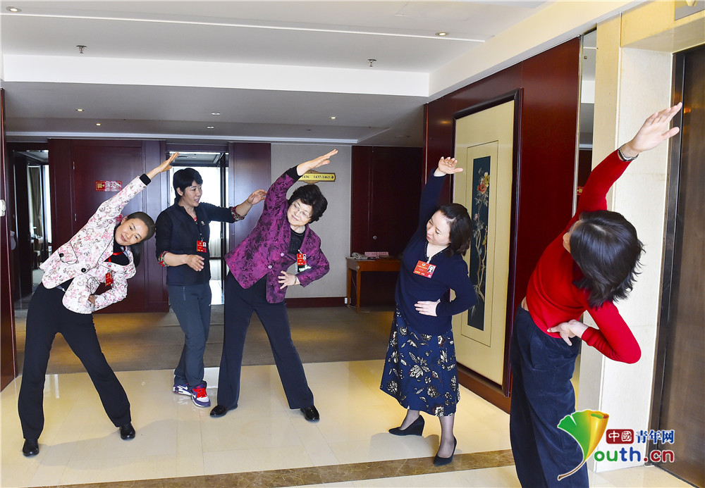 北京会议中心委员驻地,教育界的几位女委员跟随体育界委员王恋英练起了健身操。人民政协网记者 贾宁摄