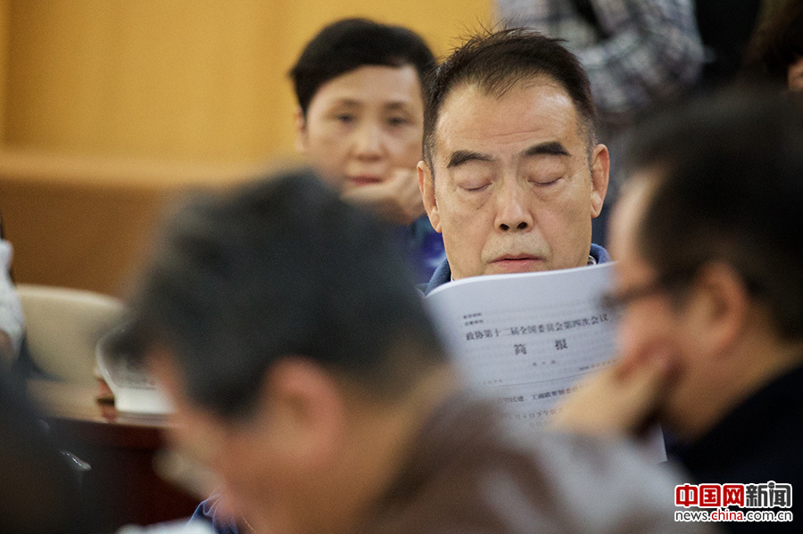 2016年3月6日,北京。全国政协十二届四次会议文艺界别委员小组讨论会上,与会政协委员畅所欲言,讨论政府工作报告。图为陈凯歌阅读政协会议简报。中国网记者 吴闻达摄