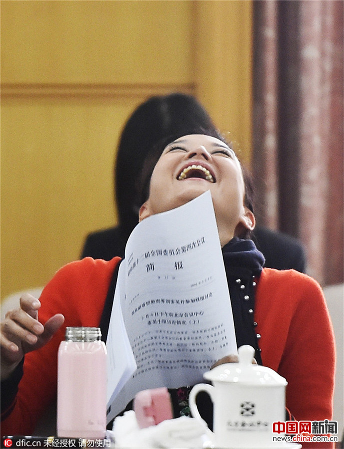 2016年3月6日,中国北京,2016年全国两会在北京召开。中国人民政治协商会议第十二届全国委员会第四次会议,政协委员列席并听取政府工作报告。图为小组会议上委员讨论政府工作报告,宋祖英委员当日身穿红大衣,讨论中途不知说到什么仰头哈哈大笑。