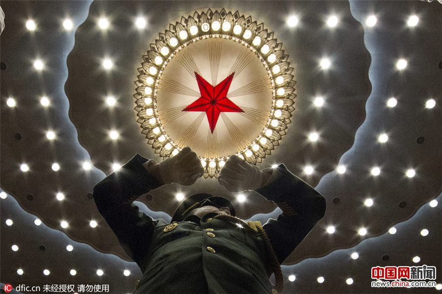 2016年3月5日,北京,军乐队演奏曲目,指挥手在人民大会堂五星穹顶下指挥。当日,2016年全国两会在北京举行,第十二届全国人民代表大会第四次会议在人民大会堂开幕。Ng Han Guan/东方IC
