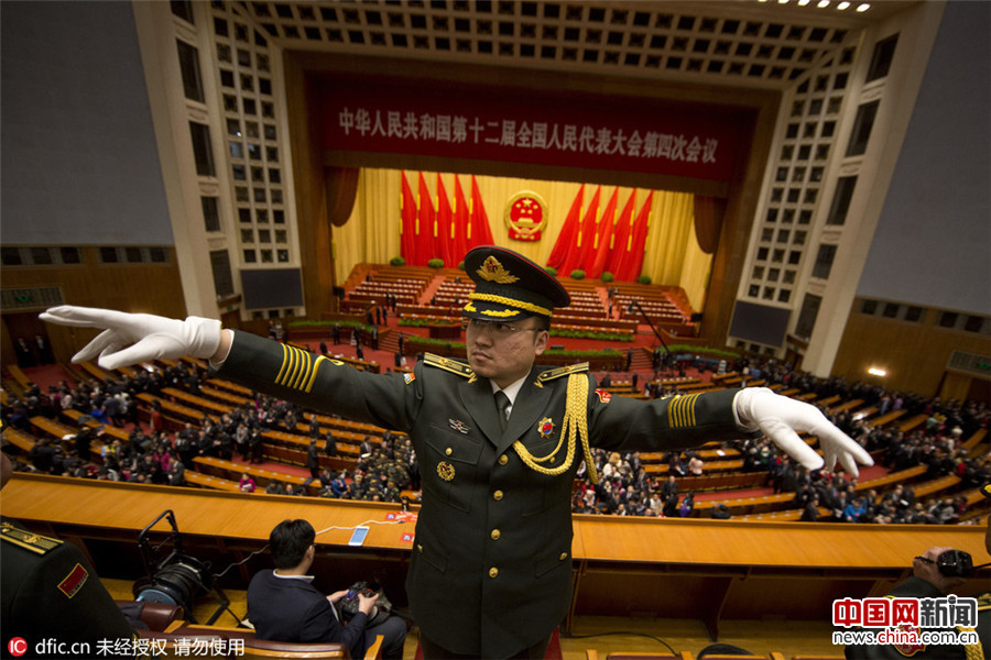 2016年3月5日,北京,军乐队演奏曲目,指挥手在人民大会堂五星穹顶下指挥。当日,2016年全国两会在北京举行,第十二届全国人民代表大会第四次会议在人民大会堂开幕。