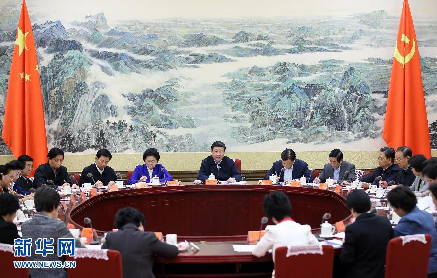 图为:2013年10月31日,党和国家领导人习近平、刘云山等在中南海同全国妇联新一届领导班子成员集体谈话。