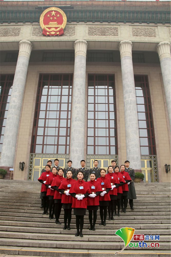 男服务员和女服员摆成心字形合影。中国青年网记者李延兵摄