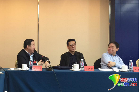 3月9日上午,在工商联小组讨论会上,全国政协委员、新华联集团董事局主席兼总裁傅军(左)为了说明中国亟需振兴民族品牌,不惜抬起手腕“秀”出自己的手表。中国青年网记者 吴楚 摄