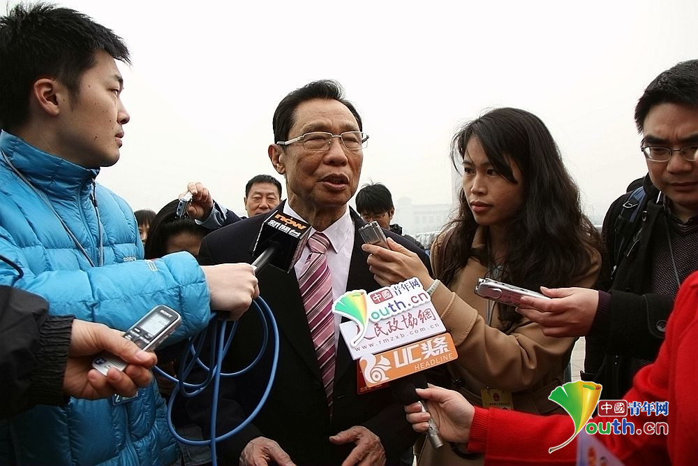 全国人大代表、中国工程院院士钟南山被众多记者包围。中国青年网记者李延兵摄