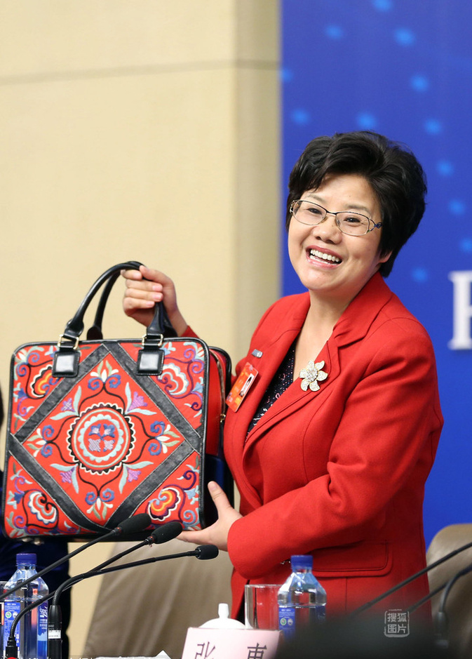 两会,会聚了全国各地的政要名人,更重要的是聚拢了媒体绝对的焦点,对于地方参会者而言,是绝佳的宣传机会。2014年3月12日,全国两会期间,贵州省妇联主席罗宁向记者展示当地少数民族妇女编制的提包。