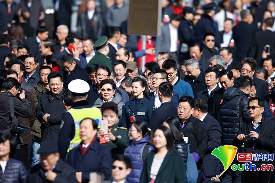 3月10日下午,全国政协十二届四次会议举行第二次全体会议,图为宋祖英等委员步入人民大会堂。中国青年网记者 张炎良 摄