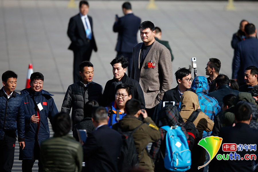 3月10日下午,全国政协十二届四次会议举行第二次全体会议,图为姚明、刘翔等委员步入人民大会堂。