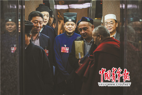 3月13日,北京友谊宾馆,全国政协委员乘电梯前往会场。