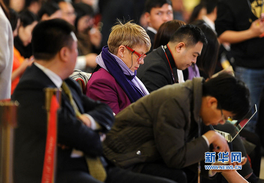 早早赶到记者会现场的各路媒体记者。新华网/中国政府网 陈竞超摄