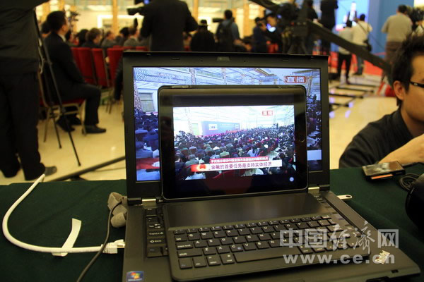 总理记者会开始后,现场WIFI足以支持网络视频播放。(中国经济网记者李焱 摄)