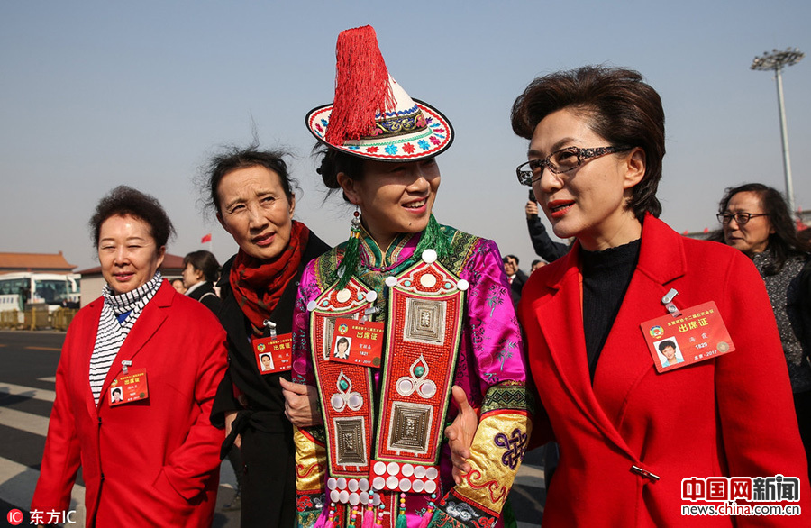 2017年3月3日,中国北京,2017年全国两会开幕。 全国政协十二届五次会议当日下午3时在北京人民大会堂开幕。北京人民大会堂红旗迎风飘扬,少数民族委员身穿醒目抢眼民族服饰,领衔“最炫民族风”。