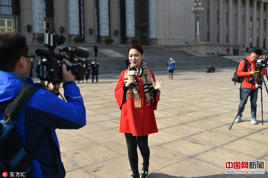 2017年3月3日,中国北京,2017年全国两会开幕。 全国政协十二届五次会议当日下午3时在北京人民大会堂开幕。北京人民大会堂前,一美女主播身穿抢镜的中国红大衣,站在她对面的摄像记者扛着摄像机,现场直播。