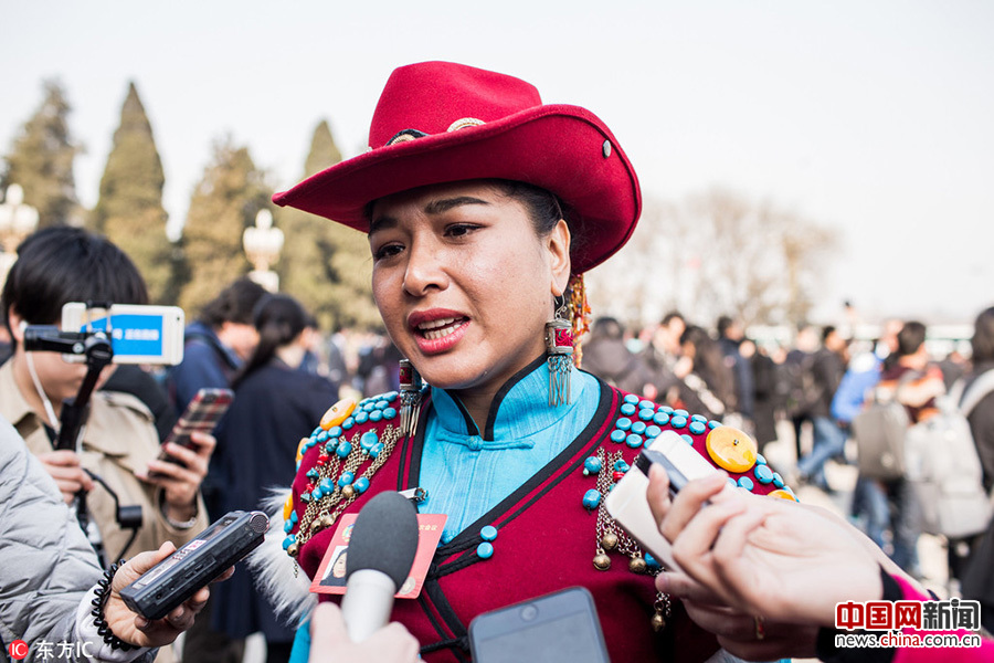 2017年3月3日,中国北京,2017年全国两会开幕。 全国政协十二届五次会议当日下午3时在北京人民大会堂开幕。北京人民大会堂红旗迎风飘扬,少数民族委员身穿醒目抢眼民族服饰,领衔“最炫民族风”,合影留念满脸笑容心情大好。