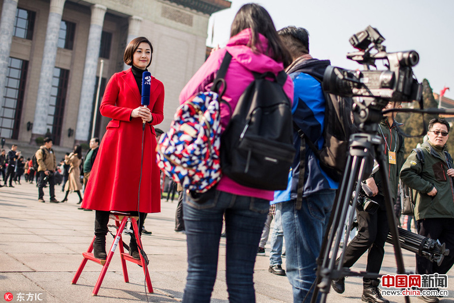 2017年3月3日,2017年全国两会在北京举行,政协开幕式将于今天15点,在人民大会堂万人大礼堂举行,会场一共三层。开幕之前,记者们站在场外踩着小梯子进行现场直播。