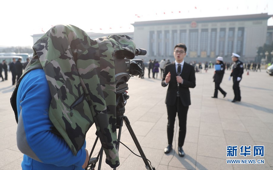 3月3日,中国人民政治协商会议第十二届全国委员会第五次会议在北京人民大会堂开幕。图为当天在大会堂东门外采访的各路记者。新华网发(王超摄)