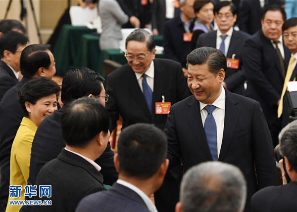 3月4日下午,中共中央总书记、国家主席、中央军委主席习近平看望参加全国政协十二届五次会议的民进、农工党、九三学社委员,并参加联组会,听取意见和建议。中共中央政治局常委、全国政协主席俞正声参加看望和讨论。新华社记者饶爱民 摄