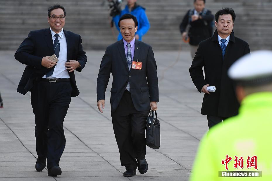 3月8日,十二届全国人大五次会议在北京人民大会堂举行第二次全体会议。图为澳门代表刘艺良(中)走出会场。