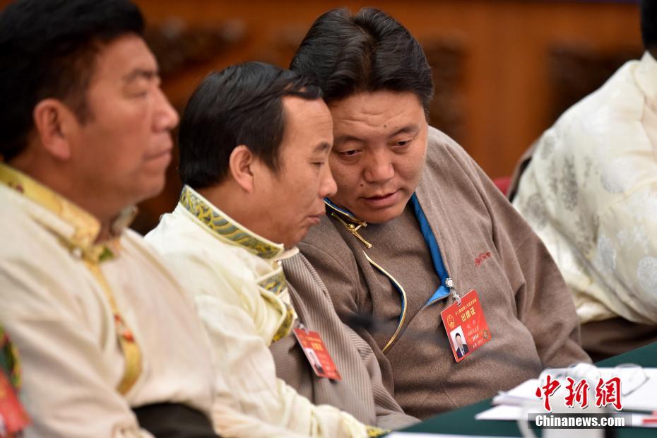 3月10日,十二届全国人大五次会议西藏代表团举行全体会议并向媒体开放,全国人大代表、那曲地区人民医院副院长次旺仁增(中)与西藏自治区林业厅厅长云丹(右)交流。中新社记者金硕 摄
