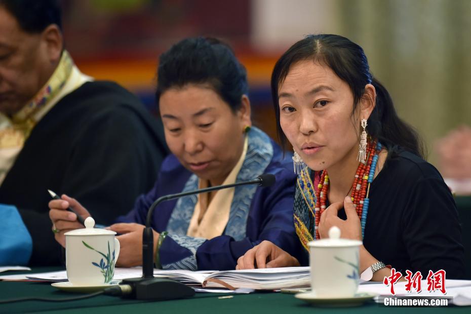 3月10日,十二届全国人大五次会议西藏代表团举行全体会议并向媒体开放,西藏山南市隆子县斗玉珞巴民族乡乡长扎西央金(右)代表发言。中新社记者金硕 摄