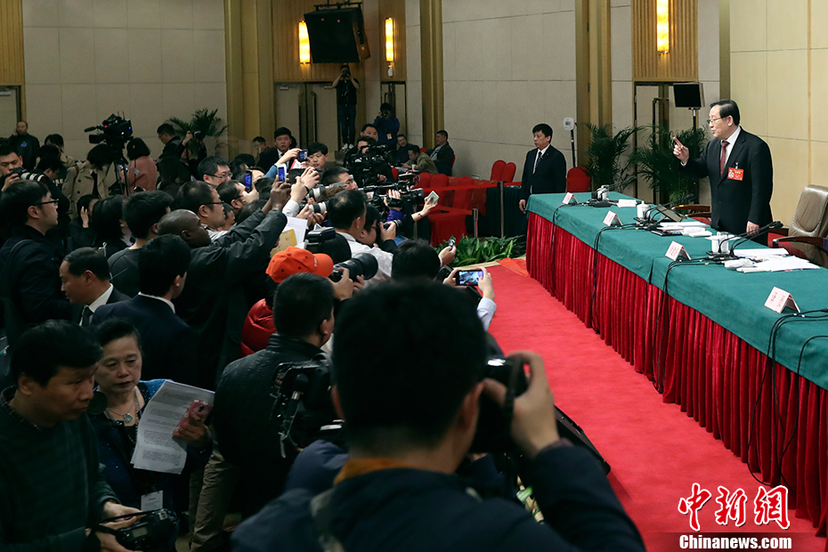 3月11日,十二届全国人大五次会议新闻中心举行记者会,邀请科技部部长万钢、秘书长徐建培就“2016年创新驱动发展战略实施进展成效和2017年重点工作”的相关问题回答中外记者的提问。 中新社记者 盛佳鹏 摄