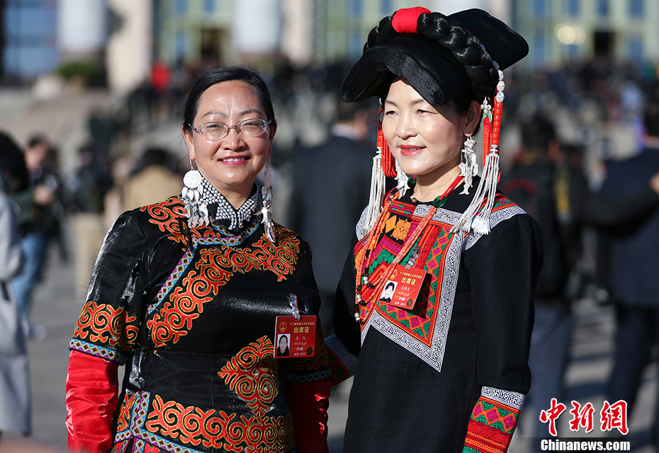 3月12日,十二届全国人大五次会议在北京人民大会堂举行第三次全体会议,彝族人大代表李旭(左)和王明雯在会场外合影。