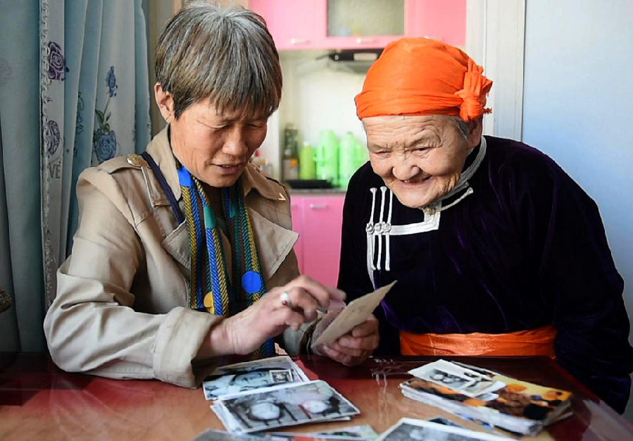 2017年5月10日,“草原母亲”都贵玛(右)和她抚养过的斯日巴勒在一起翻看照片。 新华社记者任军川摄
