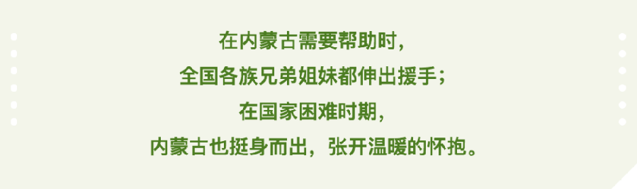 在包钢的困难时期,神州大地同心聚力,全国支援包钢建设、帮助内蒙古;在面对自然灾害的困难时,内蒙古的牧民群众奉献爱与担当,用自己的奶水把“国家的孩子”抚养成人。