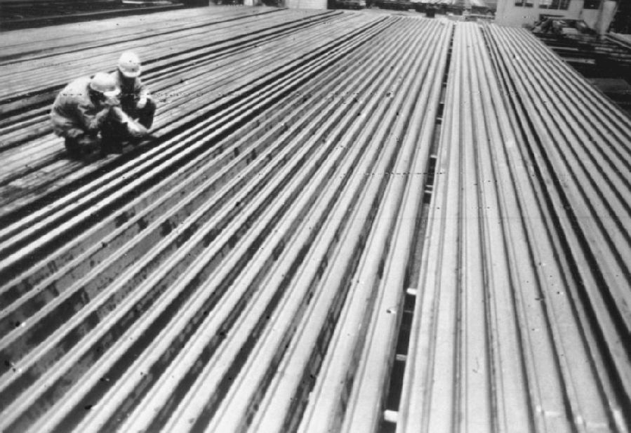 包钢大力支持京九建设,1993年10月产重轨3.5万吨,创投产以来最高纪录。这是即将运往京九工地的重轨。 新华社记者杨慎和摄(1993年11月2日发)