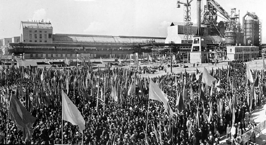 1959年10月15日,在包钢一号高炉前面广场上,举行了出铁剪彩典礼大会。 新华社记者李基禄、陆轲摄