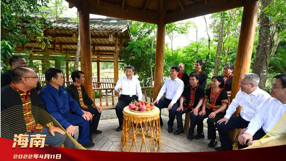 2022年4月,总书记来到海南五指山市水满乡毛纳村考察调研。村寨凉亭里,乡亲们正议农事。
