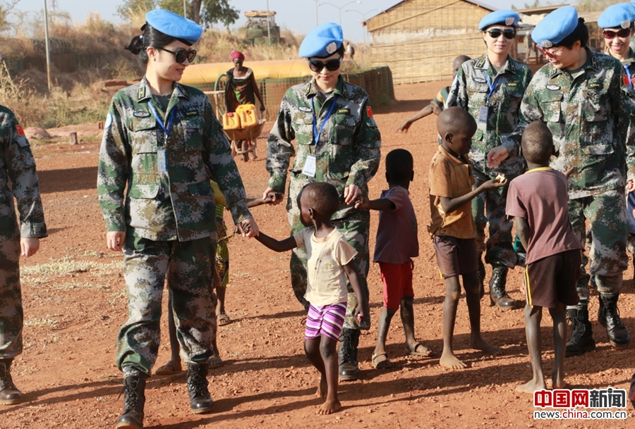 小朋友见到中国维和军人到来都上前牵手