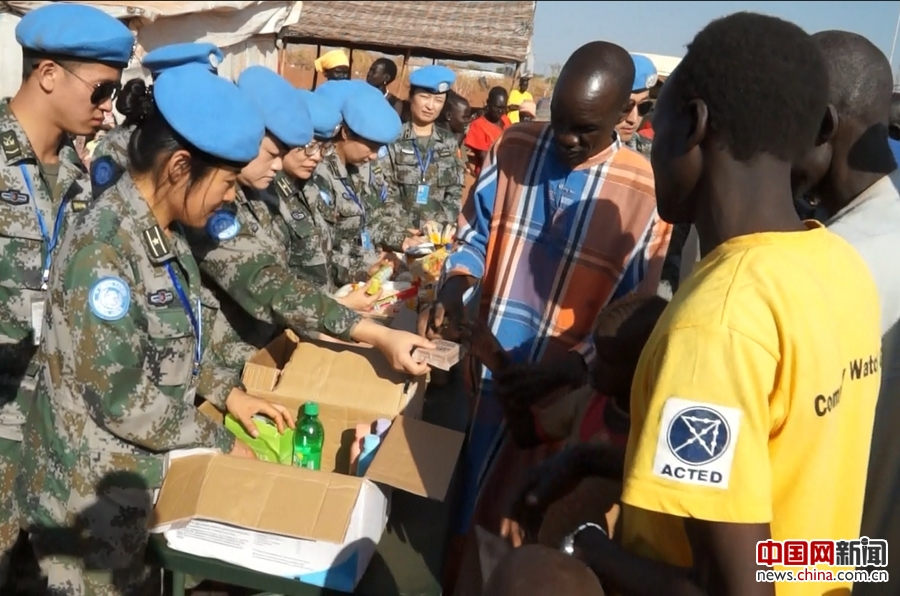第七批赴南苏丹维和医疗队队员和难民营儿童过元旦