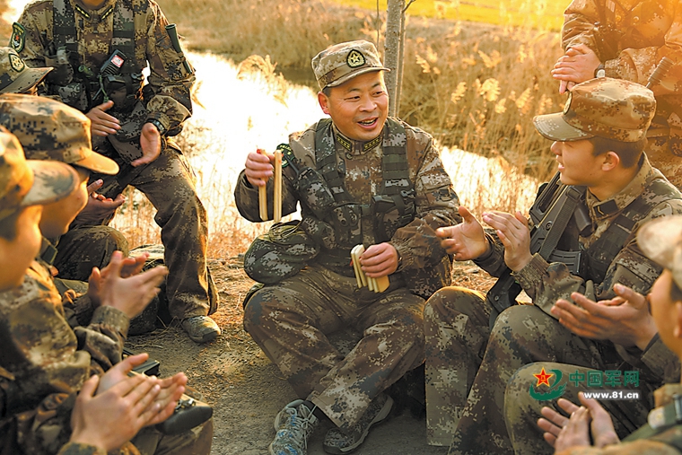 拉练小憩,政委陈俊青用快板书为新兵加油鼓劲。