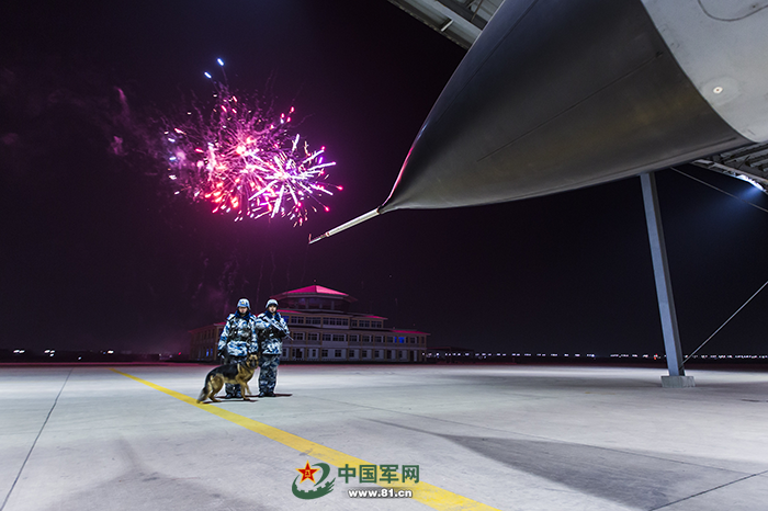 零点过后,城市的烟火渐渐稀松,守岁的人们安心睡去,年轻的战士和无言的战友继续巡逻在战机旁。