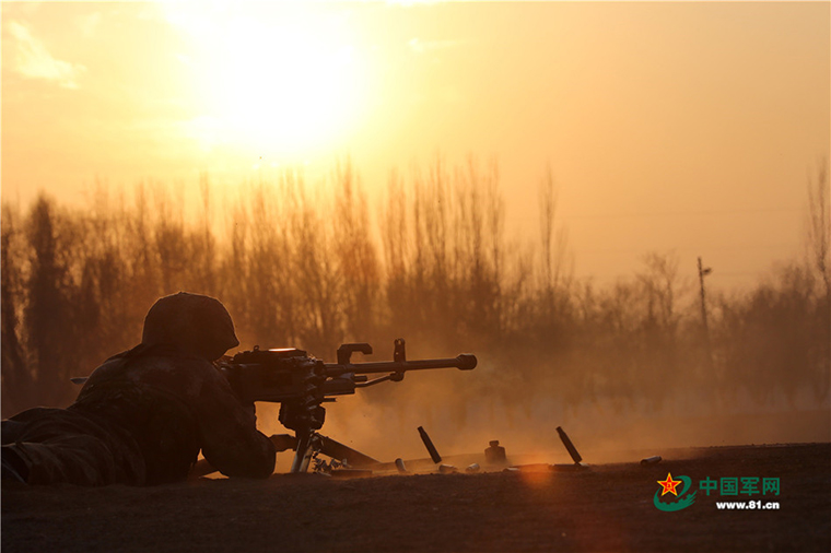 伴着夕阳进行重高机枪实弹射击考核。