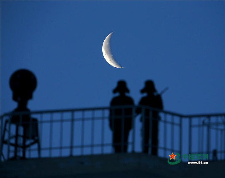 一轮弯月悬挂在高高耸立的哨塔上空,与执勤哨兵构成了一幅美丽画卷。