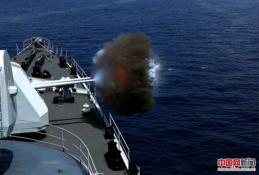 抵达巴基斯坦参加演习前,海军第二十四批护航编队组织了针对性训练。图为主炮对海射击。王长松 摄