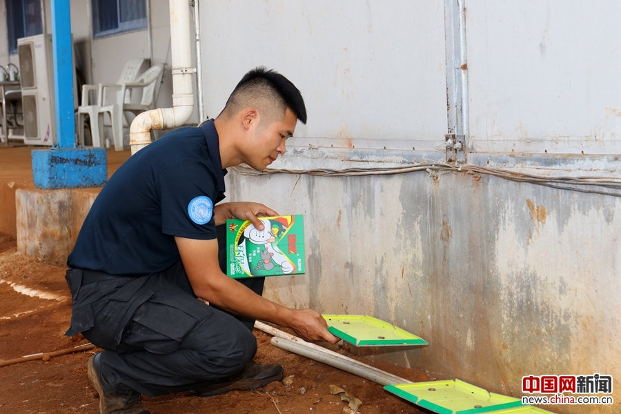 2月6日,中国四支驻利比里亚维和警察防暴队队员在餐厅附近区域安放粘鼠板灭杀老鼠。郑志刚 摄