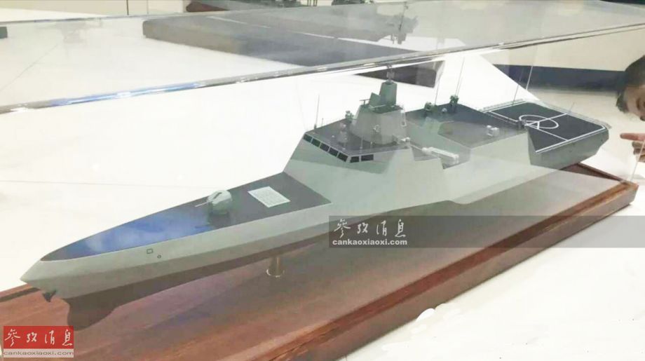 图为网络上流传的在阿布扎比防展上首次公开的中国外贸型三体护卫舰模型。根据模型判断,该舰武器系统包括一门76毫米舰炮,32单元垂发导弹装置,2个四联装反舰导弹发射器,2座近防炮以及2架舰载直升机。