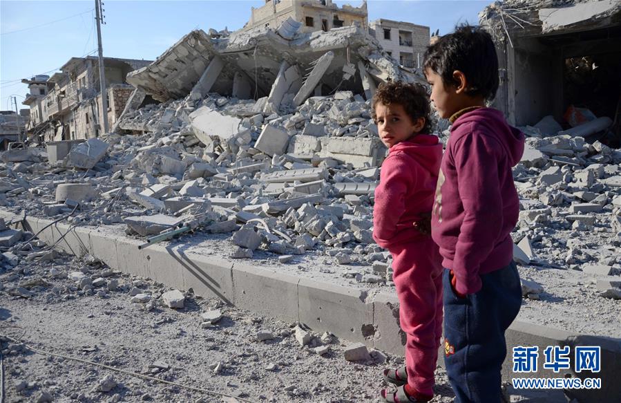 2月23日,在叙利亚北部城市巴卜,两名儿童站在被摧毁的建筑物旁。由土耳其支持的叙利亚反政府武装23日宣布从极端组织“伊斯兰国”手中夺取一个重要据点巴卜。新华社/法新