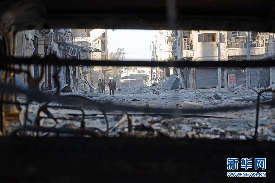 2月23日,在叙利亚北部城市巴卜,叙利亚反政府武装人员行走在被摧毁的街道上。由土耳其支持的叙利亚反政府武装23日宣布从极端组织“伊斯兰国”手中夺取一个重要据点巴卜。新华社/法新