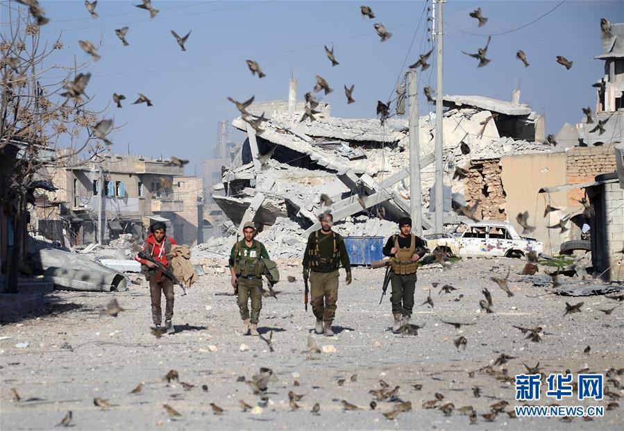 2月23日,在叙利亚北部城市巴卜,叙利亚反政府武装人员行走在被摧毁的街道上。由土耳其支持的叙利亚反政府武装23日宣布从极端组织“伊斯兰国”手中夺取一个重要据点巴卜。新华社/法新