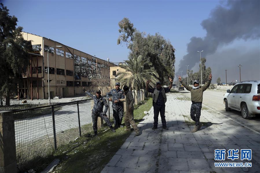 2月24日,伊拉克联邦警察在攻下摩苏尔西南郊的机场后欢呼庆祝。伊拉克政府军23日清晨开始攻打位于摩苏尔西南郊的机场以及被极端组织“伊斯兰国”占领的前政府军营地。经过数小时猛攻,政府军当天已控制该机场,并击毙多名武装人员。新华社/美联