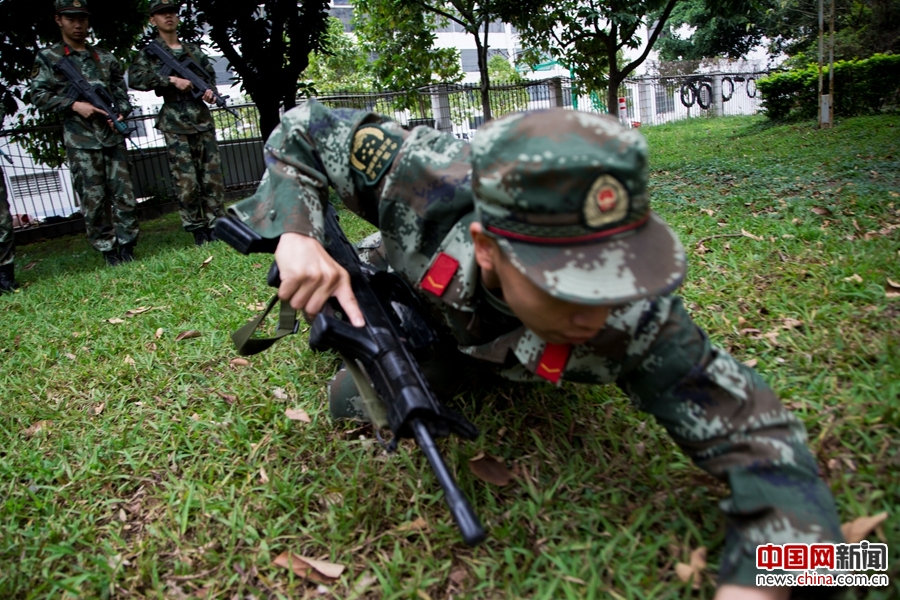 一名新兵正在战友面前演示侧身匍匐动作。 蓝惟东 摄
