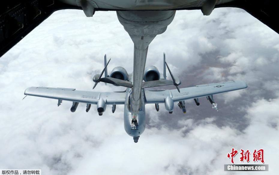 当地时间2017年3月15日,阿拉伯湾,美国空军A-10雷电Ⅱ式攻击机在飞越阿拉伯湾时由一架KC-10加油机进行空中加油。