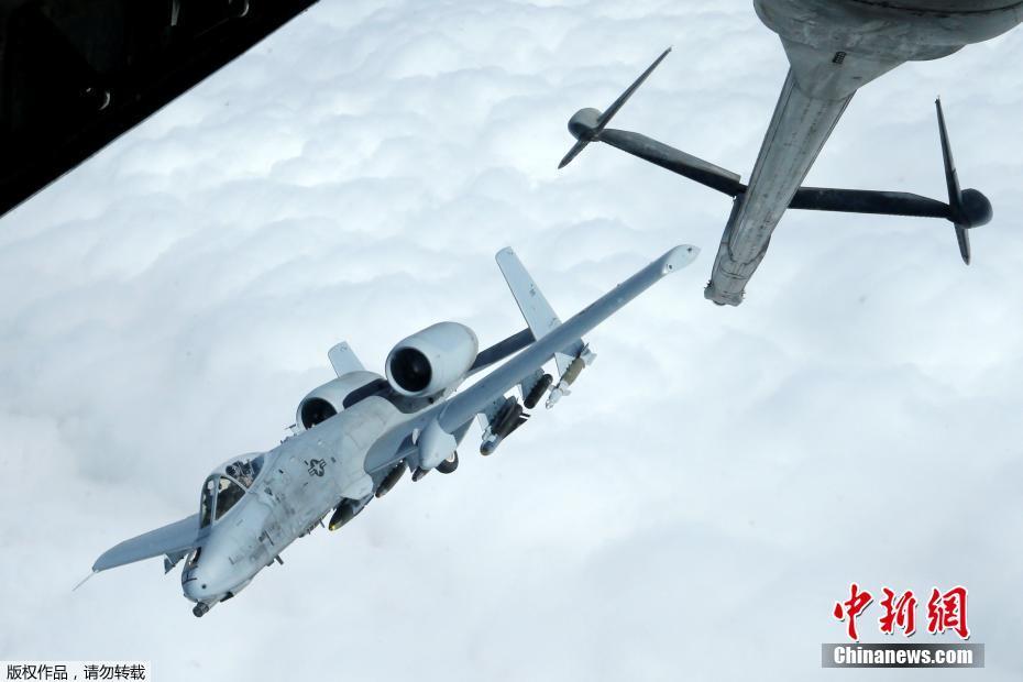 当地时间2017年3月15日,阿拉伯湾,美国空军A-10雷电Ⅱ式攻击机在飞越阿拉伯湾时由一架KC-10加油机进行空中加油。